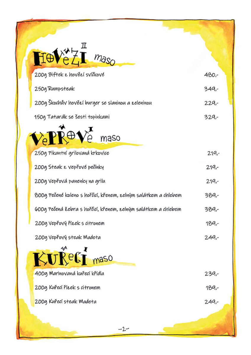 Jídelní lístek je založený na české tradiční kuchyni, ale můžete ochutnat i masa z grilu či ryby.